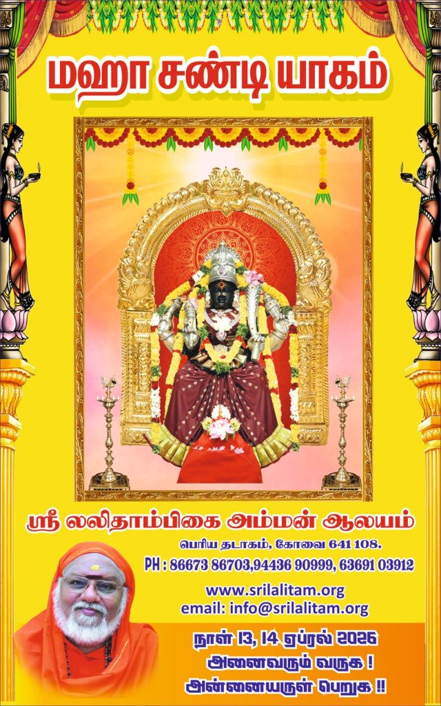 ஸ்ரீ லலிதாம்பிகை அம்மன் அருளால் நடைபெறும் மஹா சண்டி யாகம் ஒரு மிகப் புனிதமான ஆன்மிக நிகழ்வாகும். இந்த யாகத்தில் கலந்து கொள்வதன் மூலம் பக்தர்கள் தங்கள் வாழ்க்கையில் அமைதி, வளம் மற்றும் தெய்வீக அருளைப் பெறலாம். அனைவரும் குடும்பத்துடன் கலந்து கொண்டு அம்மன் அருளைப் பெற அன்புடன் அழைக்கப்படுகிறார்கள்.