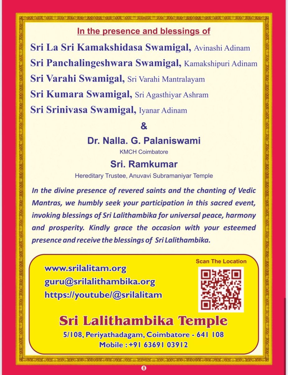 ஸ்ரீ லலிதாம்பிகை ஆலயத்தில் புனருத்தாரண அஷ்டபந்தன மகா கும்பாபிஷேகம் மிகச் சிறப்பாக நடைபெறுகிறது. 22.02.2026 ஞாயிற்றுக்கிழமை காலை 8.00 முதல் 9.30 மணி வரை நடைபெறும் இந்த திருவிழாவில் பக்தர்கள் அனைவரும் கலந்து கொண்டு அம்மனின் அருளைப் பெற்று ஆன்மிக ஆனந்தம் அடைய அழைக்கப்படுகிறார்கள். 🙏